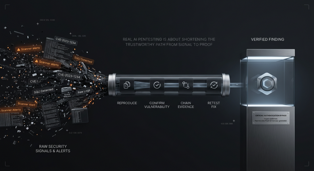 This is also where the healthiest product narratives in the category start to look similar. Penligent’s public homepage does not frame the work as “ask the best model and hope.” It foregrounds a three-step operational flow, “Find Vulnerabilities. Verify Findings. Execute Exploits,” and pairs that with “Evidence-First Results You Can Reproduce” and “Edit prompts, lock scope, and customize actions for your environment.” Even if a buyer never touches that product, those are the right questions to ask of any platform in this space because they map to genuine engineering requirements: proof before promotion, artifacts before claims, and operator control before autonomy theater. (penligent.ai)
