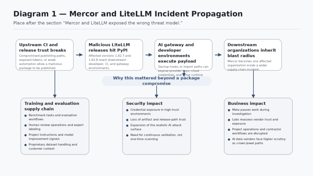 That is why the incident changed the conversation. If you still define AI security as prompt injection, jailbreaks, tool abuse, and output filtering, you are looking at the model application layer while a more consequential fight is happening inside the model production layer. Mercor told TechCrunch it was one of thousands of companies affected by the broader LiteLLM compromise. The story is not just that a Python package was poisoned. The story is that a package compromise reached into a company involved in creating and evaluating the data that helps frontier labs improve model behavior. (TechCrunch)