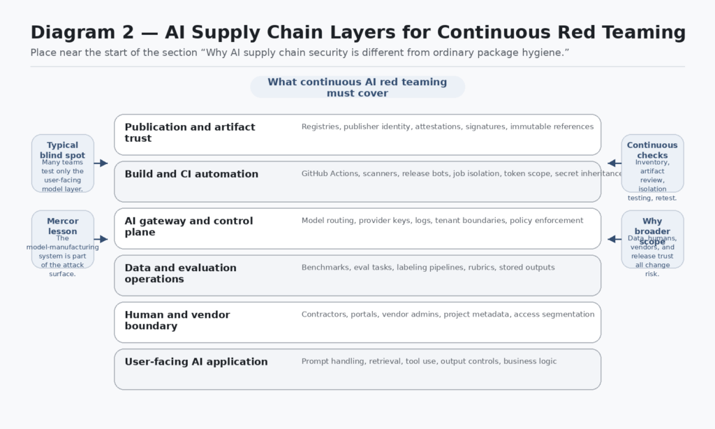 The phrase continuous AI red teaming is often used loosely. In this context, it should mean something precise: a program that repeatedly validates the high-change, high-trust parts of an AI system and its supporting supply chain, rather than running one-time abuse tests against the model interface and calling the result “coverage.” Mercor and LiteLLM both point in that direction. Neither case is well described by a quarterly pentest. The danger window was created by rapid trust decisions inside package installation, build automation, and vendor relationships. (WIRED)