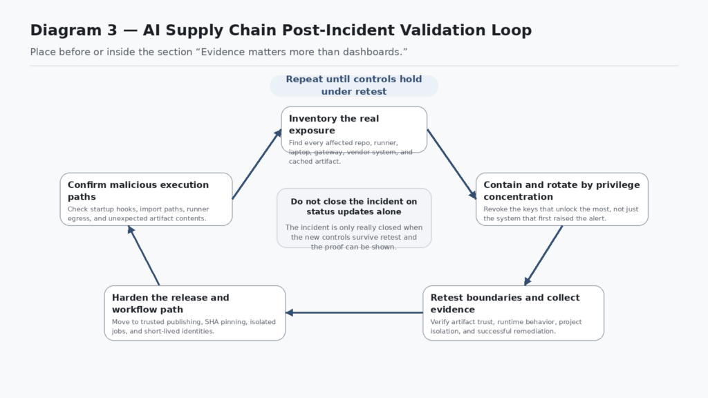One of the quieter lessons from these incidents is that incident response and validation both fail when teams optimize for status pages over proof. A dashboard can say the package was removed. A ticket can say the secret was rotated. A status update can say a new safe version shipped. None of that proves your environment is clean, your workflow is isolated, or your release path is trustworthy again. (LiteLLM)