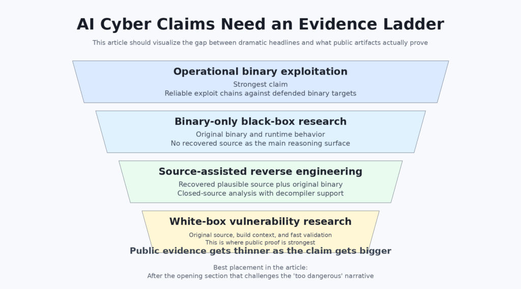 The real story, then, is not that Anthropic has a mysteriously dangerous cyber model that has already solved the hardest version of software exploitation. The real story is that Anthropic has published unusually strong evidence for source-visible AI bug finding, unusually provocative evidence for source-assisted reverse engineering, and much thinner public evidence for the stronger claim now circulating in headlines: that AI has already crossed into reliable binary-only black-box vulnerability hunting. That stronger claim has not been publicly demonstrated with the same level of clarity. (Red Anthropic)