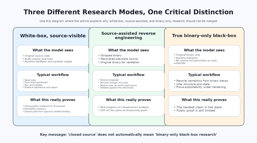 That matters because it reveals an industry pattern. The most credible public AI bug-finding evidence so far tends to cluster around source-visible or strongly source-structured work. That includes Anthropic’s public Mythos cases. It includes Google’s Big Sleep case. It does not make the work less important. It does show that the field’s loudest headlines sometimes outpace the actual distribution of public artifacts. (Red Anthropic)