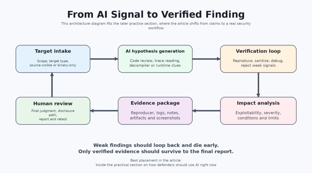 That leads to a much better practical conclusion than “the model is too dangerous.” The practical conclusion is that organizations should use AI where the evidence is already strongest: source-available code review, variant analysis, triage, sanitizer-backed validation, de-duplication, reproduction support, and report assembly that preserves evidence rather than replacing it with polished prose. Anthropic itself says current generally available frontier models remain extremely competent at finding vulnerabilities even if they are less capable than Mythos at exploit generation. It explicitly recommends that organizations start learning those workflows now rather than waiting for Mythos-class systems to arrive broadly. (Red Anthropic)
