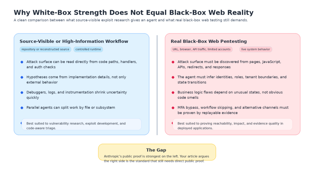 So the correct skeptical reading is not “Anthropic made it up.” The correct skeptical reading is “the public report is strong evidence of a capability jump, but it is still a capability report with narrow public observability.” That is exactly why the boundary of the claim matters so much. Once people hear “zero-days,” “browser exploit chains,” “auth bypass,” and “AI wrote working exploits,” they naturally jump to “so black-box pentesting is solved.” That leap is bigger than the public materials justify. (Red Anthropic)