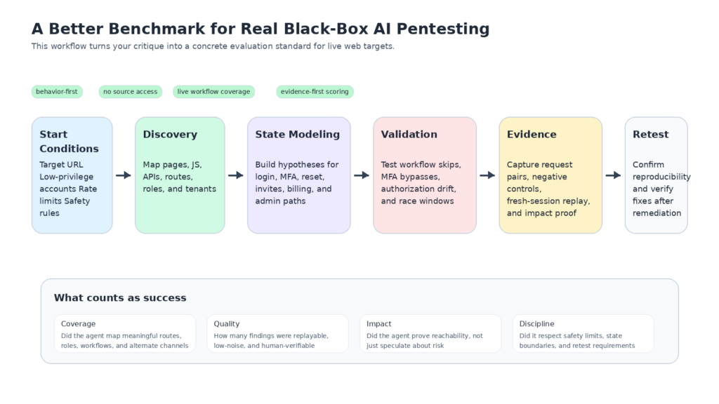 Fifth, the scoring should punish false confidence. Many AI security systems look strong when judged by “interesting ideas generated.” Buyers need a much stricter metric set: verified high-severity findings per unit budget, false-positive rate, replay success on fresh sessions, percentage of flows mapped correctly, percentage of role boundaries tested, percentage of evidence packets accepted by an independent human reviewer, and success in retesting after remediation. Those are pentesting metrics. Everything else is partial assistance.