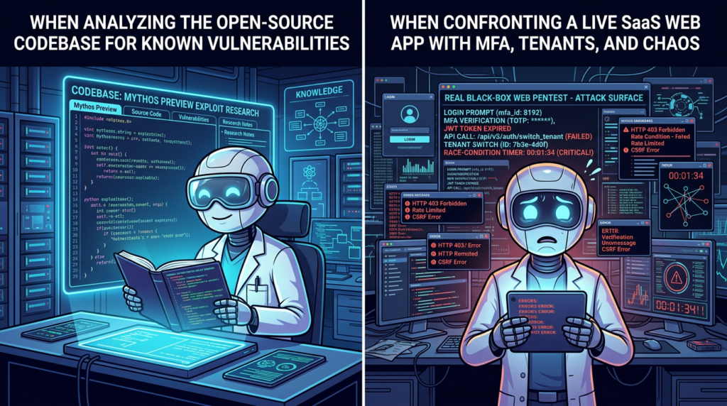Anthropic’s own wording reinforces the point. The reverse-engineering work is said to be done “entirely offline.” That makes perfect sense for responsibly exploring closed-source systems. But real external web pentesting is defined by the opposite condition: the target is live, often noisy, partially observable, sometimes rate-limited, occasionally shielded by WAFs or anti-bot systems, and full of side effects that can mislead both humans and models. An agent that succeeds in a clean offline reverse-engineering loop has not yet proven it can survive that operational mess. (Red Anthropic)