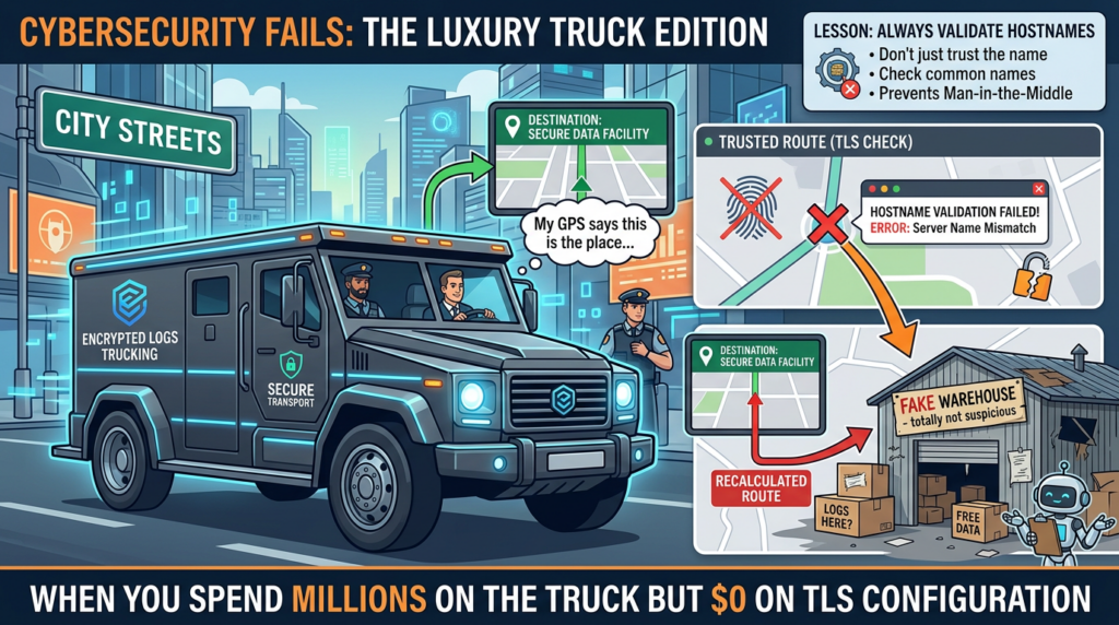 TLS is often explained too casually inside engineering organizations. Teams talk about “encrypting the connection” as if confidentiality automatically proves identity. It does not. Encryption without correct peer identity verification can still protect a session that terminates at the wrong server. Hostname verification is the step that checks whether the certificate the other side presents actually matches the destination you intended to reach. Apache’s Log4j documentation for network appenders describes the intended behavior directly: if hostname verification is enabled, the hostname in the X.509 certificate should be compared to the requested host, and the connection should fail on mismatch. Apache’s own remediation guidance for CVE-2025-68161 then acknowledges that this guarantee was not being enforced in the affected Socket Appender implementation. (Apache Logging Services)