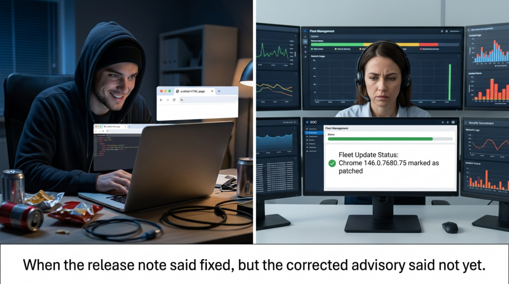 What many of these articles leave out is the version-conflict problem וה quality-control problem around “PoC” language. For a technical reader, those are not side issues. They are the difference between a clean incident-response writeup and a noisy one. If an article says “update to 146.0.7680.75” without acknowledging the March 13 correction that moved 3909 into the .80 release, it is not wrong in spirit but it is incomplete in a way that matters. If an article uses the word PoC loosely without distinguishing between speculation, crash reproduction, and exploitation, it invites readers to trust the wrong artifacts.