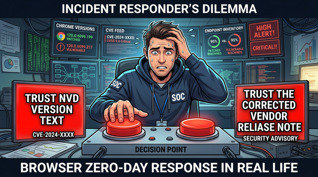 There is also a practical reason not to fetishize exploit PoCs in browser zero-day response. In a live browser incident, the first priority is not academic completeness. It is exposure reduction. If the vendor says the issue is exploited in the wild, the bug class is memory corruption, and the trigger is a crafted HTML page, you already know enough to make the right decision: patch, verify, inventory downstream products, and review browsing-risk controls. The engineering cost of waiting for a “better PoC” is usually much larger than the analytical benefit.