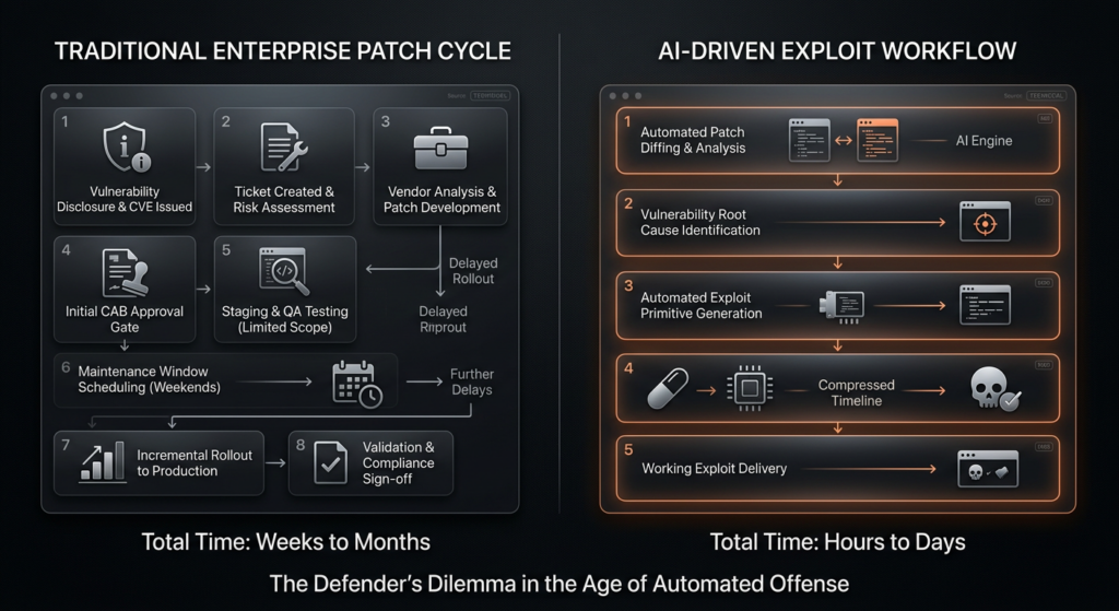 चौथा चरण एन-डे रूपांतरण है। एंथ्रोपिक के मिथोस पोस्ट ने पूरे रिलीज़ में सबसे महत्वपूर्ण बिंदुओं में से एक उठाया है: वास्तविक दुनिया में होने वाले नुकसान का एक बड़ा हिस्सा एन-डे से आता है, क्योंकि पैच बग को प्रकट करते हैं और असली सीमित कारक वह समय है जो हमलावर को पैच को एक कामकाजी एक्सप्लॉइट में बदलने में लगता है। उस वाक्य को नज़रअंदाज़ करना आसान है क्योंकि यह "हर प्रमुख ब्राउज़र" जितना नाटकीय नहीं है। यह शायद दस्तावेज़ में सबसे अधिक परिचालनात्मक रूप से महत्वपूर्ण पंक्ति भी है। कई संगठन इसलिए नहीं हारते क्योंकि किसी लैब ने ज़ीरो-डे खोजा, बल्कि इसलिए हारते हैं क्योंकि वे सार्वजनिक प्रकटीकरण और विश्वसनीय शोषण के बीच के अंतराल को बंद करने में विफल रहते हैं। यदि मॉडल उस अंतराल को संपीड़ित करते हैं, तो रक्षकों को सिर्फ एक शोध चुनौती ही नहीं, बल्कि एक शेड्यूलिंग संकट भी विरासत में मिलता है। (लाल।मानवनिर्मित।com)