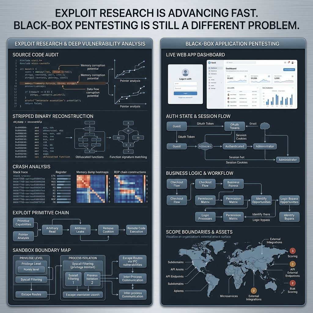 एक बहुत ही सक्षम मॉडल अनुमान उत्पन्न कर सकता है, कोड पढ़ सकता है, बाइनरीज़ के बारे में तर्क कर सकता है, और यहां तक कि एक्सप्लॉइट्स भी बना सकता है। इनमें से कुछ भी स्कोप्ड, टारगेट-साइड वैलिडेशन की आवश्यकता को समाप्त नहीं करता। किसी को फिर भी क्रेडेंशियल्स को सुरक्षित रूप से संभालना होगा, स्थिति बनाए रखनी होगी, प्राधिकरण सीमाओं का सम्मान करना होगा, सहवर्ती क्षति से बचना होगा, सबूत इकट्ठा करने होंगे, सुधारों के बाद फिर से परीक्षण करना होगा, और जो कुछ भी किया गया उसका ऑडिट ट्रेल रखना होगा। इसीलिए एक्सप्लॉइट रिसर्च और ब्लैक-बॉक्स पेनेटस्टिंग के बीच सार्वजनिक अंतर इतना महत्वपूर्ण है। मॉडल अपस्ट्रीम में शानदार हो सकता है और फिर भी डाउनस्ट्रीम में असफल हो सकता है, जहाँ वास्तविक एप्लिकेशन अपनी सबसे कठिन सच्चाइयाँ रखते हैं: लाइव स्टेट, व्यावसायिक लॉजिक, ऑब्जेक्ट संबंध, रेसी व्यवहार, आंशिक अनुमतियाँ, और नाजुक प्रोडक्शन स्थितियाँ। (सीएसआरसी.एनआईएसटी.जीओवी)