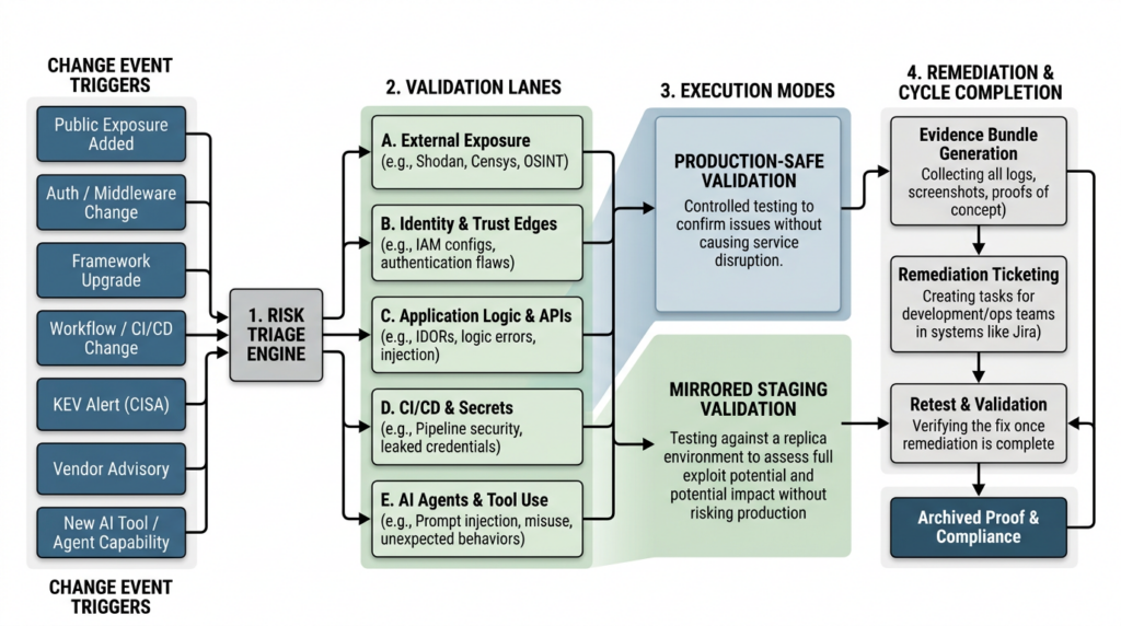 Those lanes should be broad enough to matter and narrow enough to operationalize. For most modern organizations, five lanes are enough to start: external exposure and attack surface drift, identity and trust edges, application logic and APIs, CI/CD and secret handling, and AI-agent attack surfaces. If you can build a working trigger-and-evidence loop in those five lanes, you will already be ahead of most security programs that still treat pentesting as a calendar deliverable.