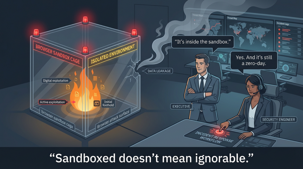 Security teams sometimes hear “sandboxed code execution” and assume the risk is contained. In reality, browser exploitation is often a chain, not a one-step event.