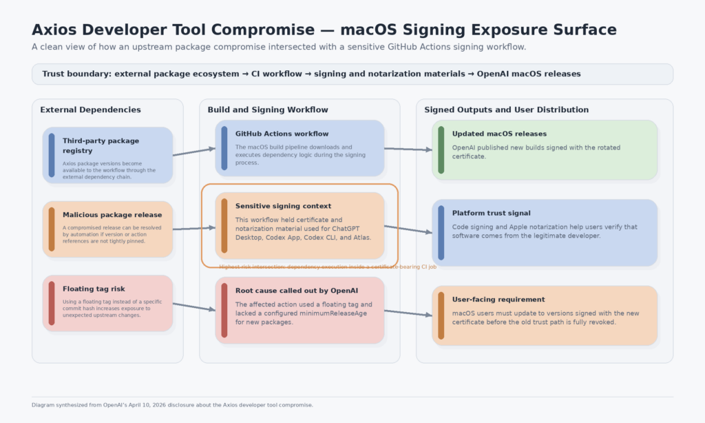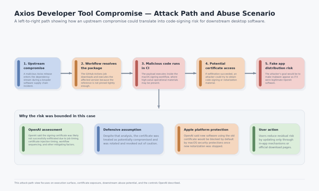 OpenAI’s Axios developer tool compromise notice was easy to misread if you only skimmed the headline. The company did ない say attackers had compromised OpenAI user data, taken over published applications, or stolen API keys. It said something more specific and, for software supply chain defenders, more interesting: a malicious Axios version ran inside a GitHub Actions workflow tied to the macOS app-signing process, and that workflow had access to certificate and notarization material used to sign OpenAI’s macOS applications. OpenAI found no evidence that its software had been altered or that the signing certificate had actually been exfiltrated, but it still revoked and rotated that certificate, published new builds, and told macOS users to update. (openai.com)