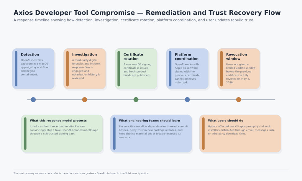 That explains two decisions some readers found odd. The first is why OpenAI coordinated with Apple rather than merely rolling new binaries. The answer is that the platform trust system is part of the remediation. The second is why OpenAI did not immediately hard-fail every older Mac build on the same day. The FAQ says immediate revocation could cause legitimate older apps to be blocked during download or first launch, so OpenAI used a time window while monitoring for abuse. In other words, the response balanced platform trust, end-user continuity, and abuse prevention. That is an operational decision shaped by Apple’s distribution model, not by general incident response slogans. (openai.com)