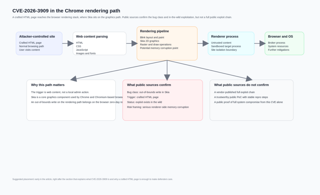 This is the right frame for CVE-2026-3909. A crafted HTML trigger in Skia means the initial risk belongs on the browser’s untrusted-content path. The official record tells us enough to justify urgent remediation. It does not tell us enough to publish a confident exploit narrative about which subcomponent is corruptible, how deterministic control is achieved, or whether the observed in-the-wild usage was part of a larger chain. That uncertainty should narrow the claims, not the urgency. (nvd.nist.gov)