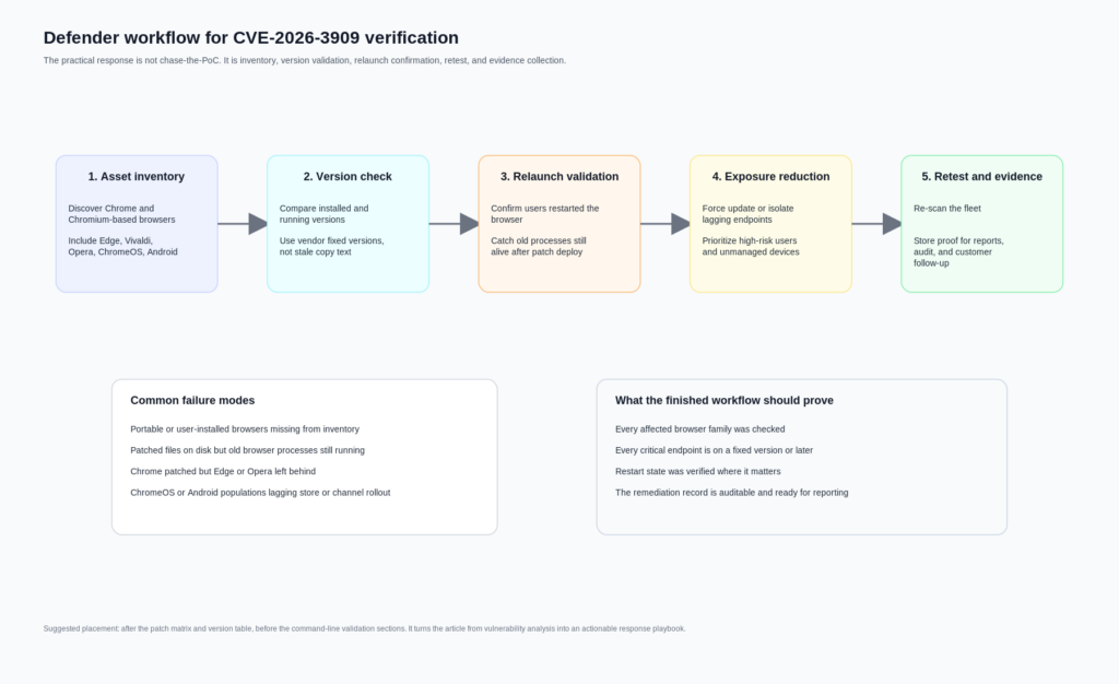 A reliable response to CVE-2026-3909 starts with asset truth, not exploit gossip. Teams usually lose time on browser zero-days because browser reality is messy. Endpoints often have more than one Chromium-based browser. Some users run Chrome and Edge side by side. Developers keep Canary or Beta installed. VDI or gold images lag. Portable or user-scoped installs bypass normal software inventory. Mobile updates depend on store rollout. ChromeOS channel differences complicate version assumptions. All of that is more common than any team likes to admit. (Chrome Releases)
