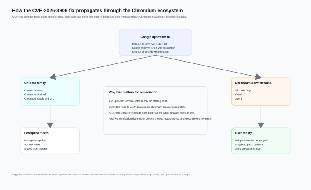 The table above is built from vendor release notes rather than guesswork. Chrome desktop fixed CVE-2026-3909 in 146.0.7680.80 on March 13. Android’s March 13 release states that 146.0.76380.119 carries the same security fixes as the corresponding desktop release unless otherwise noted. ChromeOS stable and LTC notes explicitly include CVE-2026-3909. Microsoft says Edge 146.0.3856.62 contains the Chromium fix. Vivaldi and Opera both published official notes for their downstream patching. (Chrome Releases)