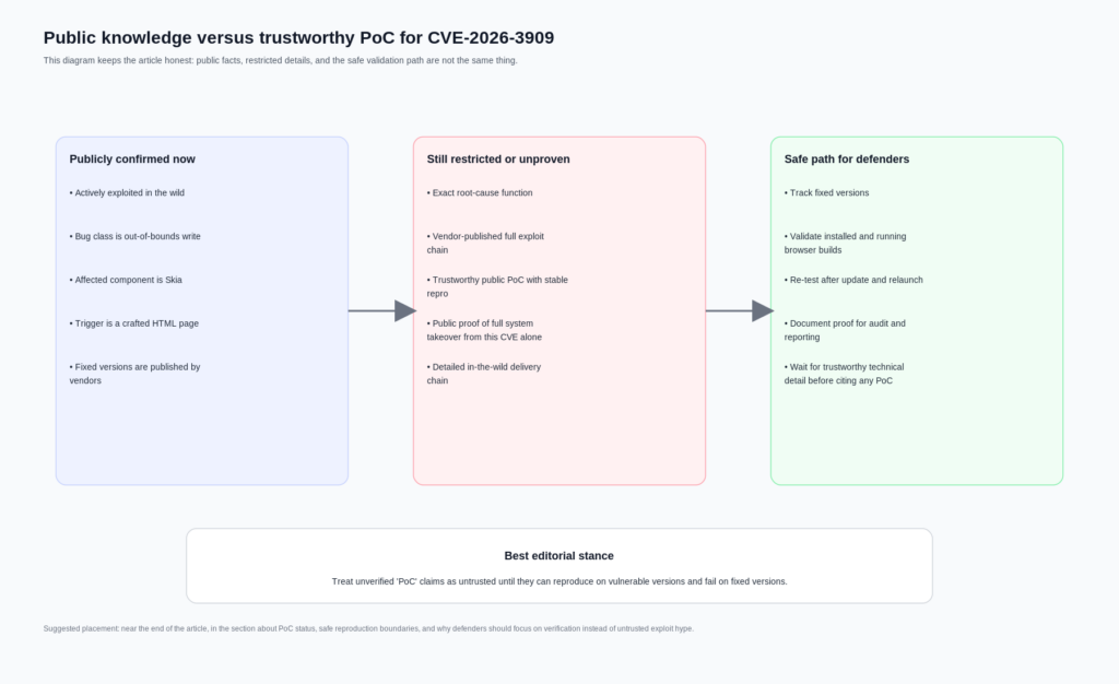 That difference matters because a lot of browser-vulnerability writing collapses three separate things into one word. A vulnerability can be publicly acknowledged. It can be actively exploited by a sophisticated actor. And it can still lack a public, auditable, technically useful PoC. CVE-2026-3909 is in exactly that category. It is real. It is urgent. It is operationally important. But it is not responsibly described as “fully public exploit material” just because the keyword “poc” is popular in search results. (nvd.nist.gov)