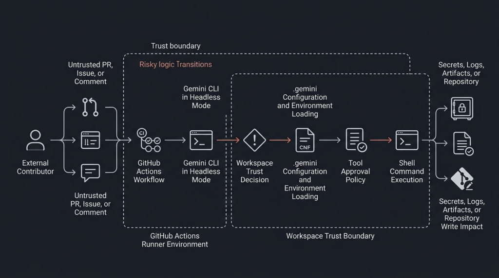 The two issues described by the advisory are related but distinct. The first issue concerns folder trust in headless mode. In earlier versions, Gemini CLI running in CI environments automatically trusted workspace folders for loading configuration and environment variables. If the CLI was run against untrusted directory contents, such as a repository or pull request controlled by an outside contributor, malicious data in the local .gemini/ directory could lead to remote code execution through environment variables or configuration behavior. (ギットハブ)