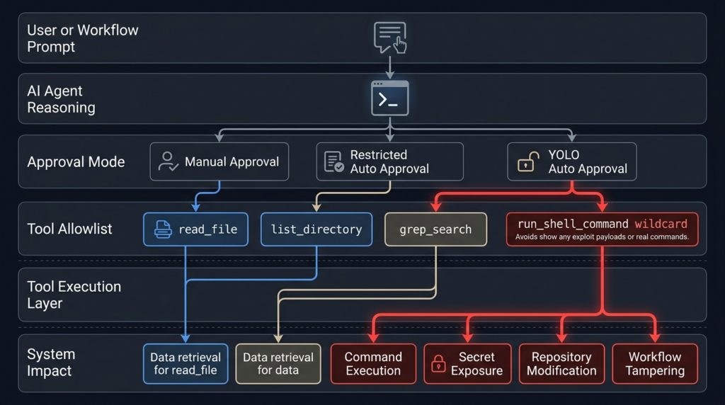 The Gemini CLI RCE advisory matters because it shows the exact failure mode security teams should expect from AI coding agents in CI/CD. A workspace trust decision that feels reasonable in a local CLI can become dangerous in headless automation. A tool allowlist that looks restrictive can fail under a different approval mode. A prompt injection that sounds like a model issue can become command execution when shell tools and secrets live in the same runtime.