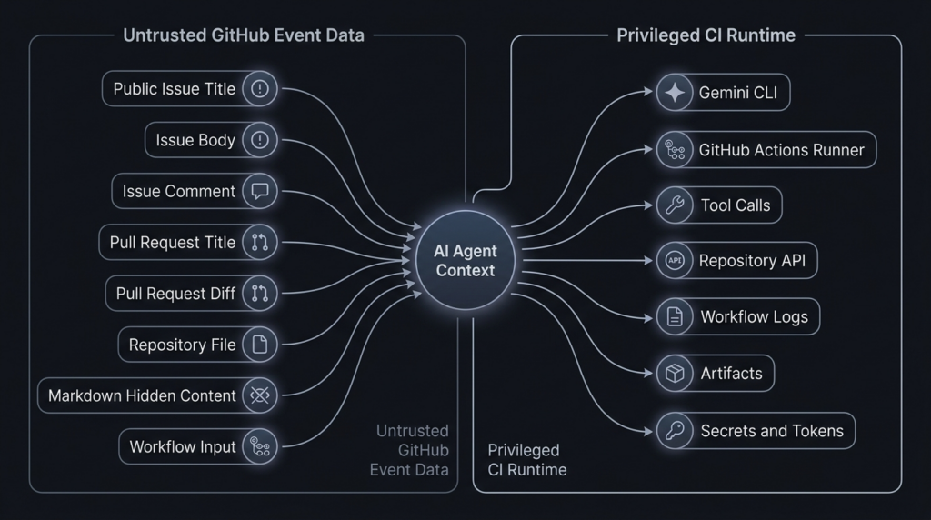 | Untrusted source | PR body, issue comment, repository file, .gemini/ directory | Attacker can place instructions or configuration-like content where the agent will read it | Treat all external repository and GitHub event data as hostile |