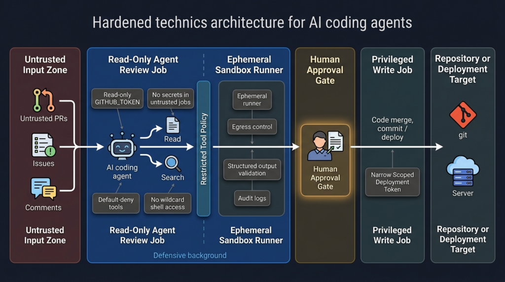 The right response is not to ban AI coding agents. The right response is to engineer them like privileged automation. Patch the specific vulnerability. Then remove broad trust, remove unnecessary secrets, remove wildcard shell access, reduce token permissions, separate untrusted and trusted jobs, use ephemeral runners, validate outputs, and continuously test the boundary.