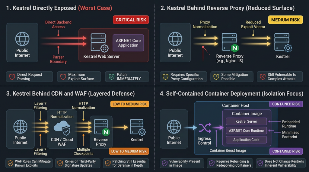 At the same time, exploitability is not automatic. An app that has patched Kestrel, does not expose the vulnerable runtime, does not trust proxy-injected identity headers from untrusted paths, strictly authorizes every endpoint in application code, avoids raw request forwarding, and has a normalizing proxy that rejects malformed chunked requests has a very different risk profile from an app that depends on edge-only authorization and runs an unpatched self-contained deployment.
