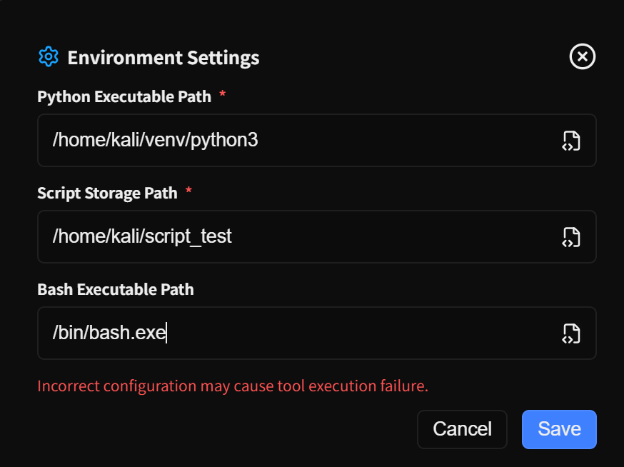 On first launch, Penligent requires runtime configuration. The public config section lists three required fields: Python Executable Path, Script Storage PathBash Executable Path. The example values in the public docs are /usr/bin/python3 for Python and /bin/bash for Bash, and the Python interpreter note says a virtual environment is recommended. (GitHub)