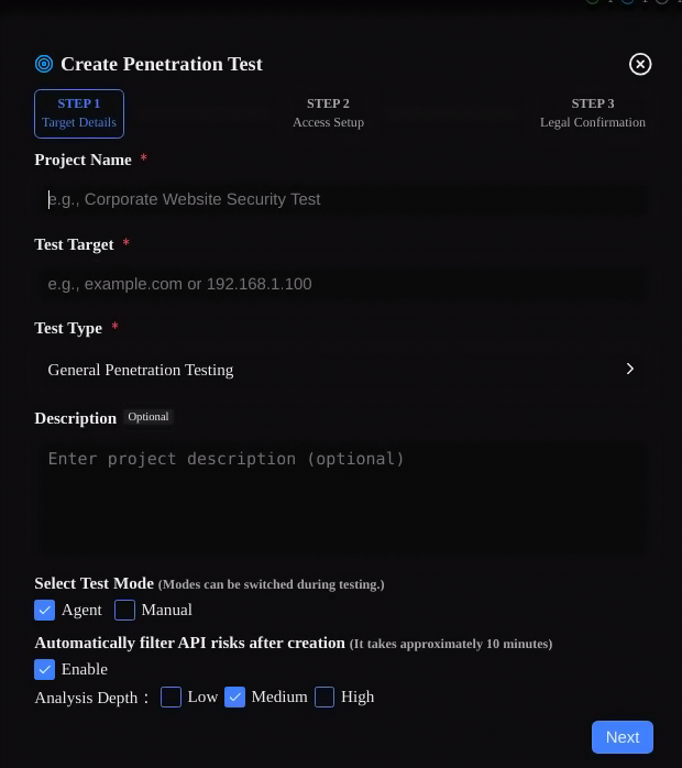 After installation and configuration, the next documented step is to click New Project on the left. Penligent’s public docs say project creation is split into multiple steps so users can supplement and confirm information before a pentest begins. In the first step, you enter target information and configure task execution options. The documented required fields are Project Name, Test Target테스트 유형. Optional fields include 설명, Mode, Automatically Filter API RisksAnalysis Depth. (GitHub)