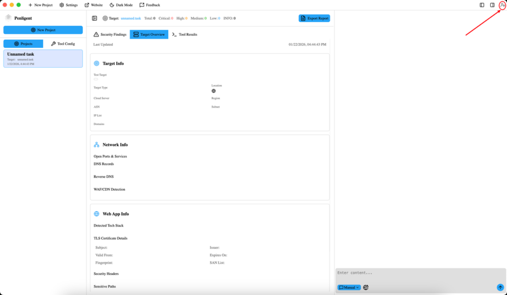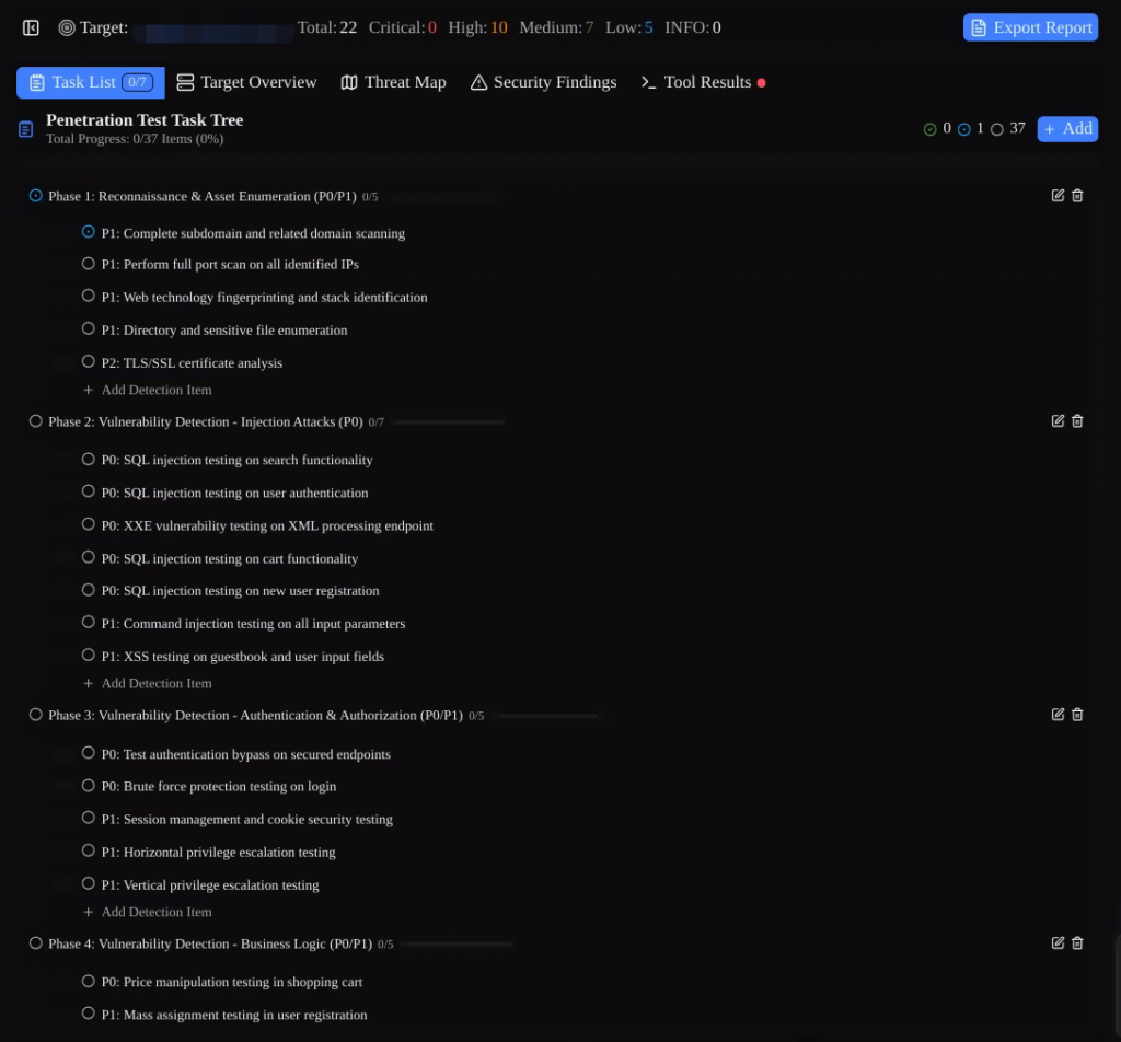 After you create the task, the public docs say the pentest workflow begins immediately. The documented first stage is initial information gathering and planning of the overall pentest approach and route, which the docs estimate at about five to ten minutes. Penligent also creates a testing task list that acts as a baseline checklist. During the pentest, users can edit tasks, delete them, retest, mark them as completed, or skip them. (GitHub)
