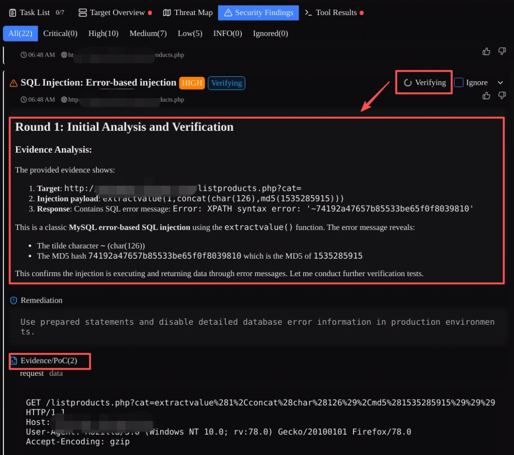 Penligent’s public docs say discovered risks are recorded in Security Findings, and the execution results plus evidence chain for each associated tool are consolidated there. Users can click 확인 to re-validate a risk. According to the docs, once Verify is triggered, Penligent matches the vulnerability type to verification techniques and tactics, performs at least three rounds of verification, and then provides the verification result. (GitHub)