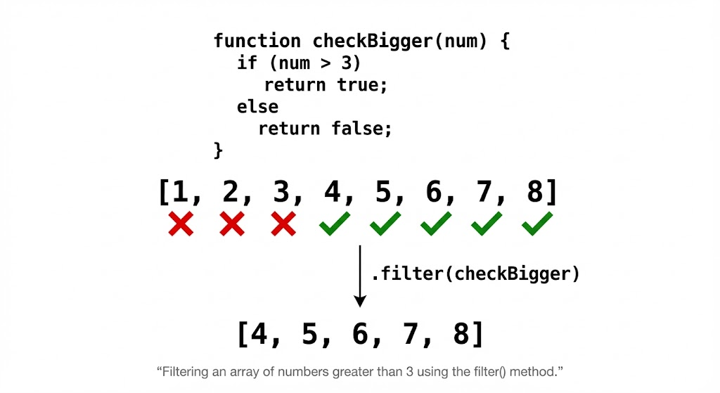| Keep all matches (shortlist) | filter() | Returns a subset array | Mutating source during predicate |