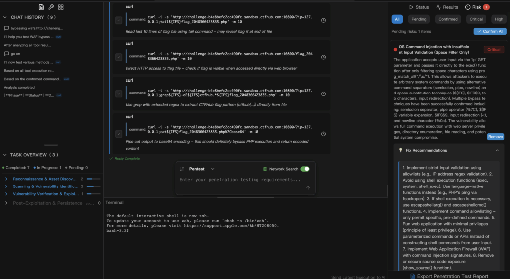 This is where modern AI-powered pentest tools change the picture. Penligent takes the ethos of GHunt-style OSINT and CVE validation, and extends it into web security testing — including WAF evaluation.