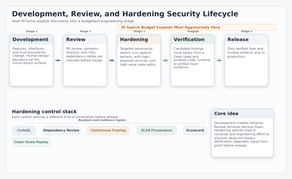 The pressure to split review from hardening is partly economic. Human attention is the bottleneck in development. Human judgment is also central in review. Hardening is different. Once a system has stabilized enough to be worth stress-testing, a lot of the work can be parallelized through static analysis, dependency gating, fuzzing, range-based testing, provenance verification, and agentic search loops. The budget constraint becomes more visible there than in earlier phases. That is why it makes sense as a separate stage rather than an extension of PR review. (Drew Breunig)