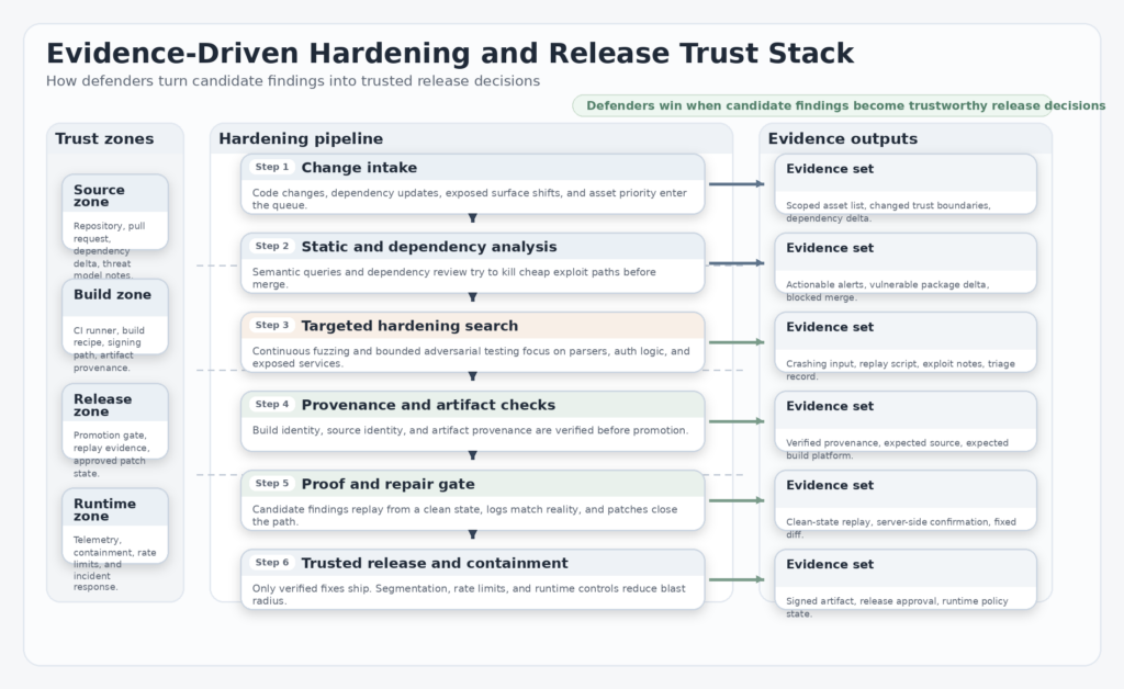 It also changes how security teams should talk to engineering leadership. If hardening is a real stage, then it needs real inputs and outputs. Inputs include a target surface, a token or time budget, a coverage strategy, and a policy for when evidence counts as valid. Outputs include replayable proof, a patch, a release decision, or a documented negative result. Without that structure, AI-driven testing becomes theater: lots of output, little confidence. (SLSA)