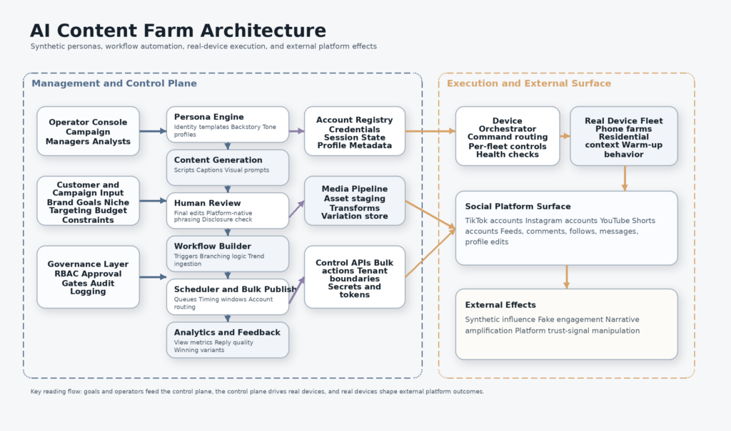 The second mistake is assuming the problem is “AI content” rather than “AI-enabled operations.” A low-quality synthetic video is easy to mock. A coordinated system that can spin up personas, route content through device-backed accounts, learn from engagement, and adapt faster than manual moderation is much more important. The difference is the control plane. The backend is what turns a pile of generated assets into an operating system for narrative distribution.