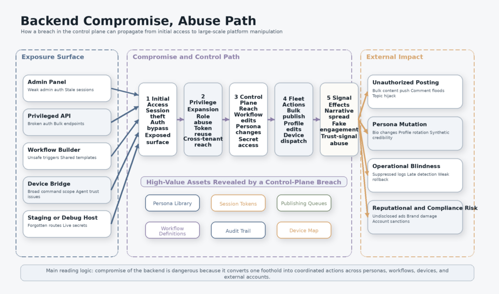 This is why backend compromise is such a big deal even when the public story sounds absurd. A meme posted through a hijacked content factory is funny. A backend that can update bios, push bulk posts, touch real devices, or repurpose successful content variations is a strategic control surface. If you are investigating the system, the backend is where you will find the operational truth. If you are defending the system, the backend is where you will most likely lose it.