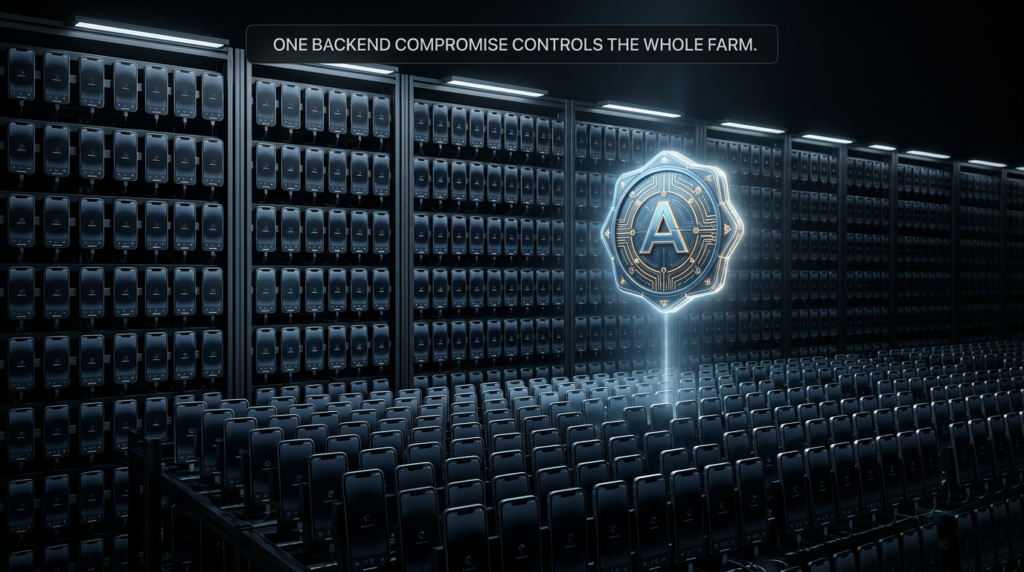 These examples help for two reasons. First, they remind defenders not to wait for a glamorous AI-specific exploit category. Ordinary authentication and control-plane flaws are often enough. Second, they make the risk concrete for buyers and engineers who still hear “phone farm” and imagine a low-tech warehouse problem rather than a security architecture problem. The dangerous part is not the rack of phones. The dangerous part is the administrative surface that binds them together.