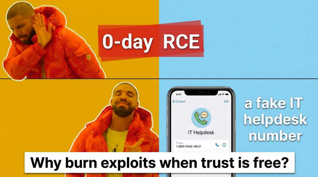 Pretexting“This person is a verified vendor.”Phone (Vishing), LinkedInData exfiltration, Org chart mappingVerification callbacks, InfoSec training
