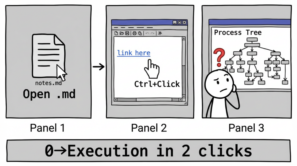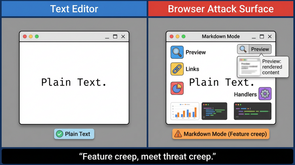 Notepad used to be a text viewer/editor. Markdown mode turns it into a renderer. Renderers create clickable objects. Clickable objects invoke handlers. Handlers launch other processes. Suddenly your “text editor” sits at the top of an execution chain.
